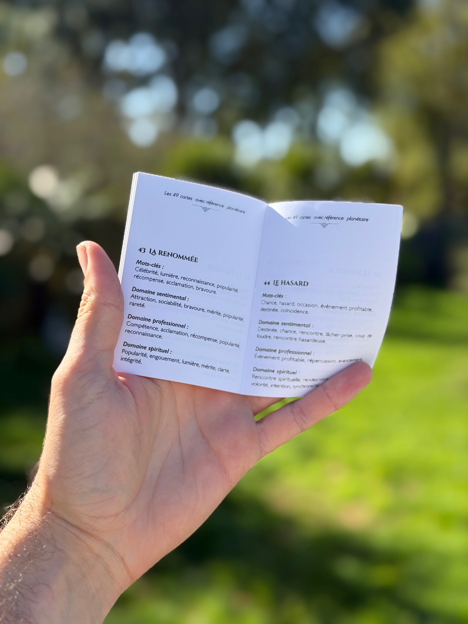 Associe le symbole de la carte, sa planète, à ta question et écoute ce que ton ressenti te dit. Les associations entre cartes sont importantes : leur position relative modifie souvent le sens.